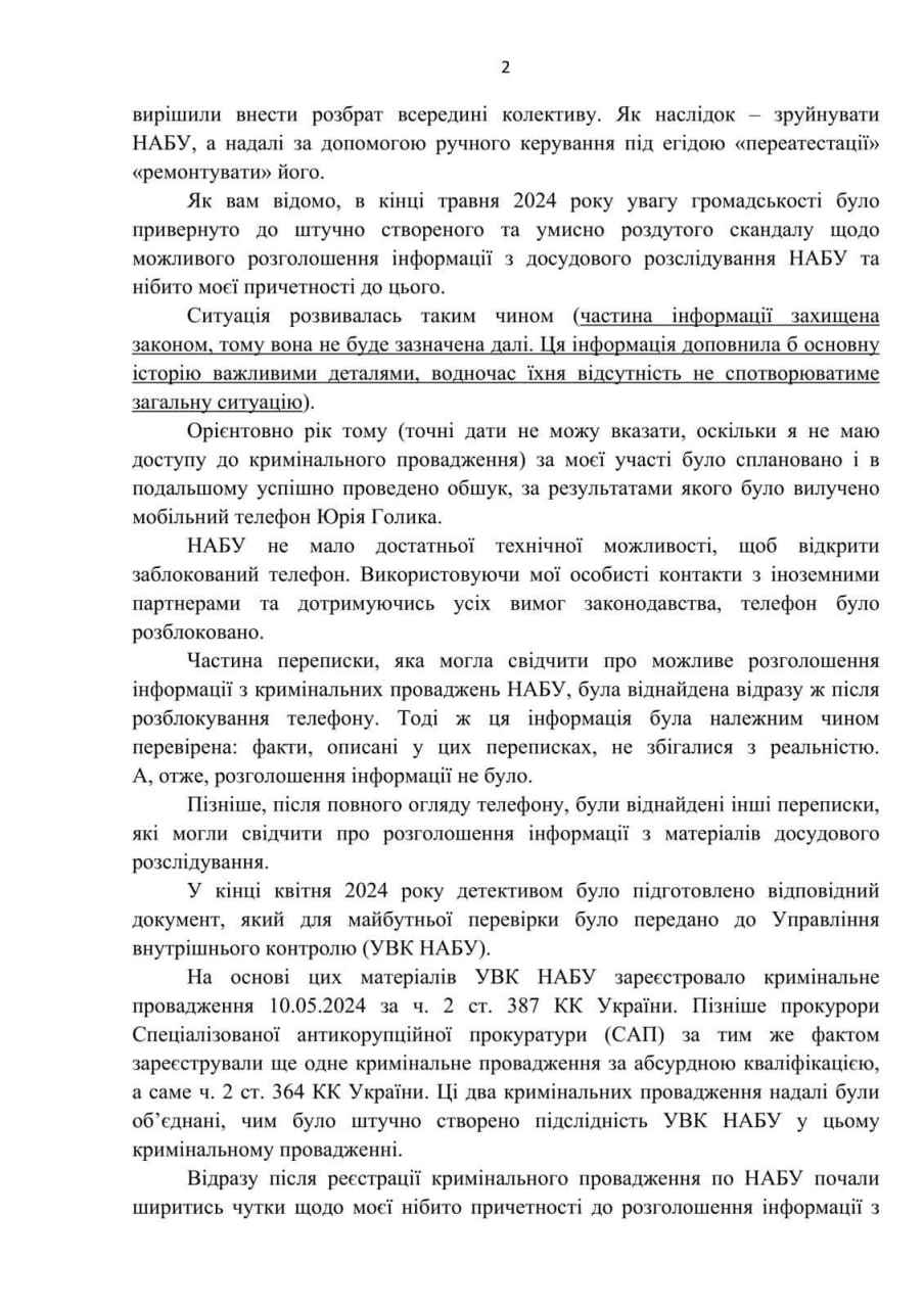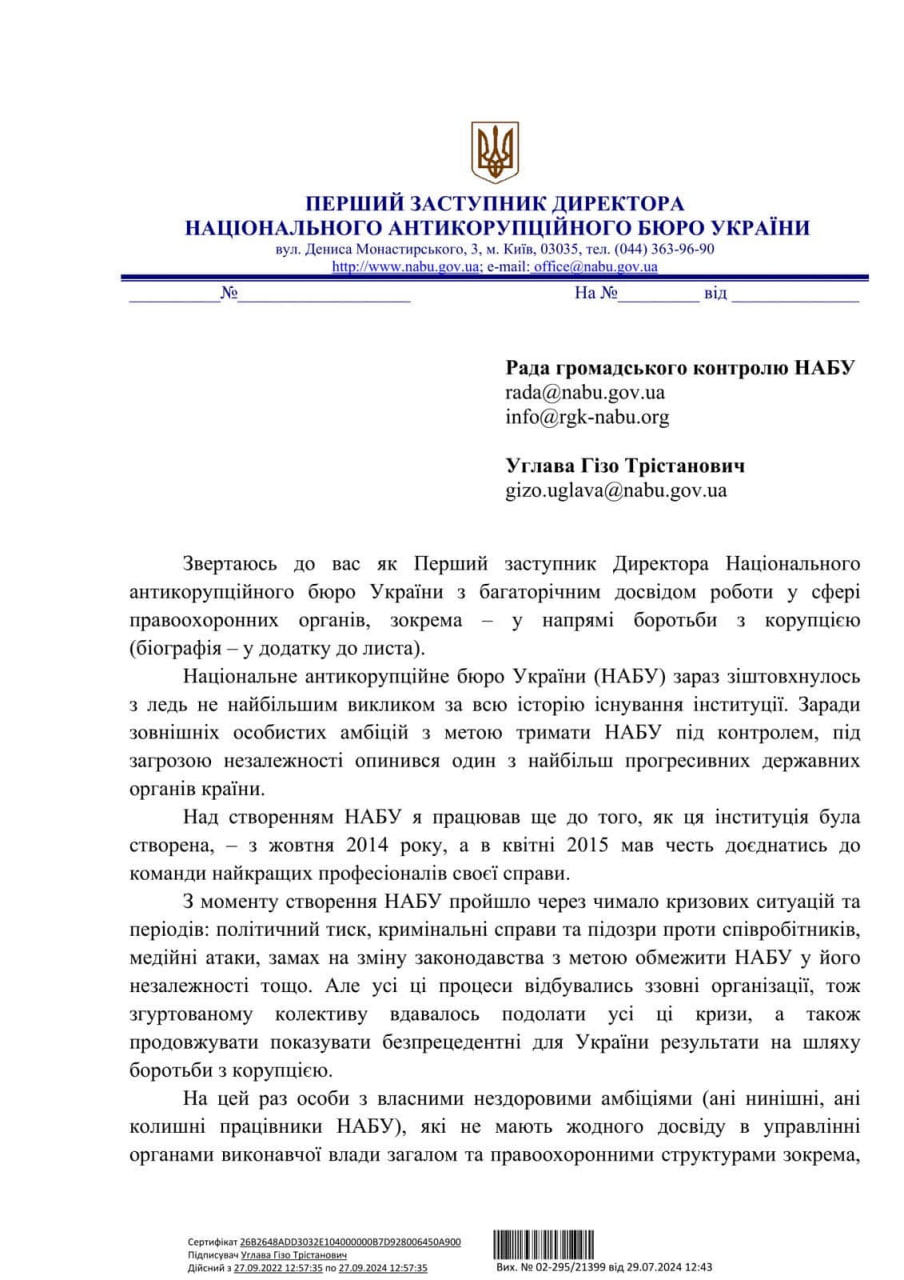 Він надіслав листа до Ради громадського контролю НАБУ та міжнародних організацій.