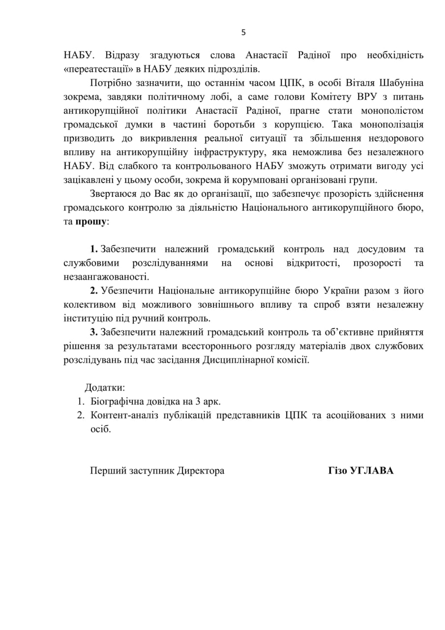 Заступник голови НАБУ Гізо Углава написав звернення проти голови Центру протидії корупції Віталія Шабуніна та голови комітету Верховної Ради з антикорупції Анастасії Радиної.