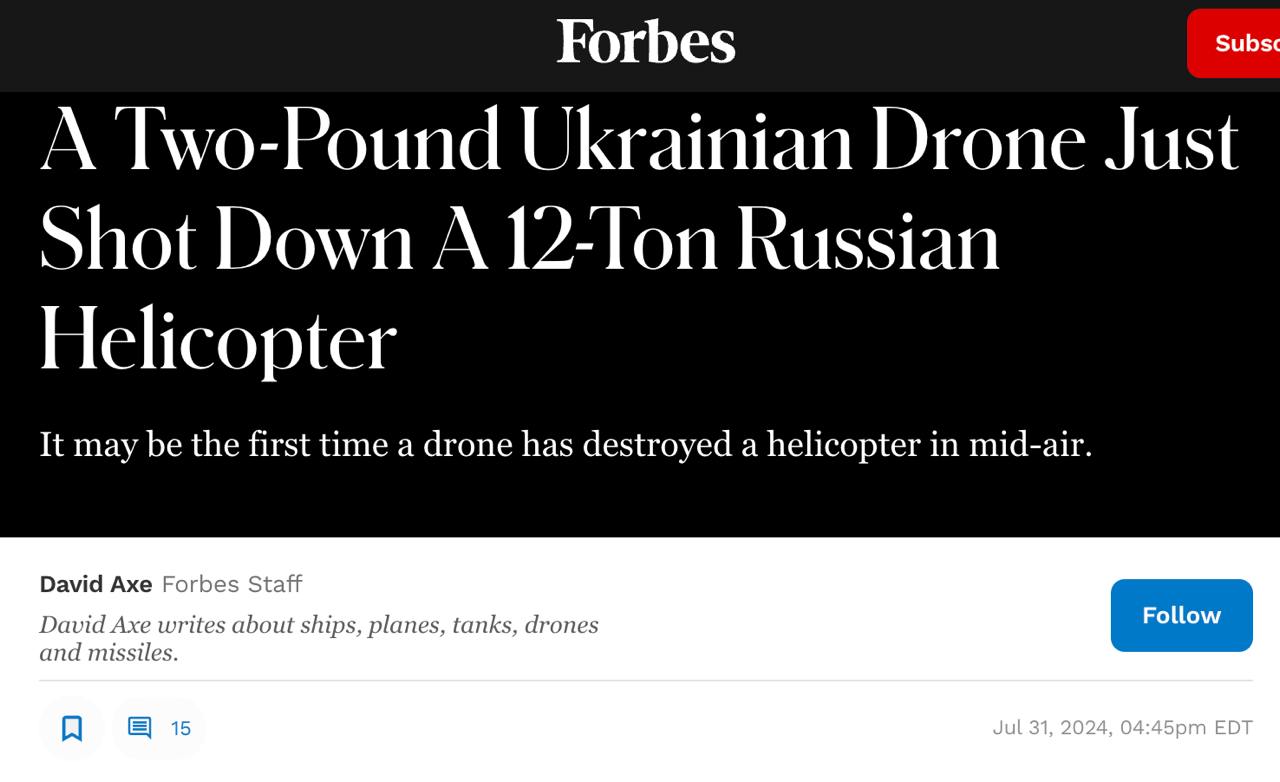 Ймовірно, ЗСУ вчора вперше вдалося збити російський гелікоптер у повітрі за допомогою дрону. Про це пише Forbes.
