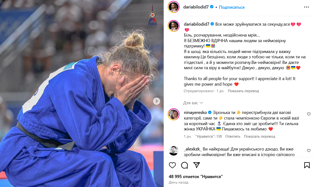 Перед цим у стартовому поєдинку Олімпіади в Парижі Білодід перемогла свою суперницю лише за шість секунд. Після поразки українка розплакалася.