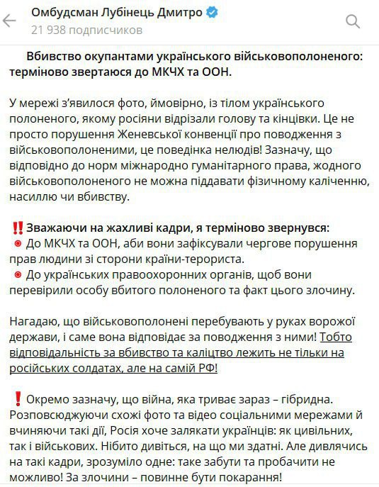 19.31 Омбудсмен Дмитро Лубинець заявляє, що російські військові, ймовірно, розчленували українця, який перебував у полоні.