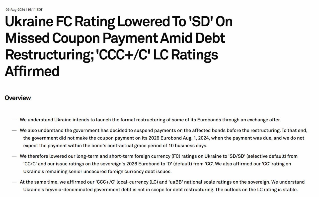 Україна 1 серпня мала виплатити доходи за єврооблігаціями, але цього не сталося, тому "ми знизили наші довгострокові та короткострокові рейтинги в іноземній валюті України до SD/SD".