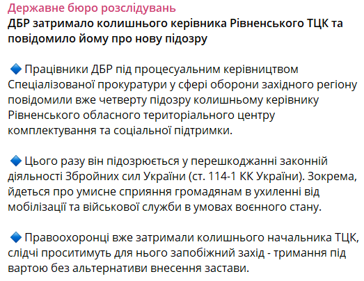 Державне бюро розслідувань (ГБР) оголосило про нову підозру колишньому голові Рівненського обласного ТЦК.
