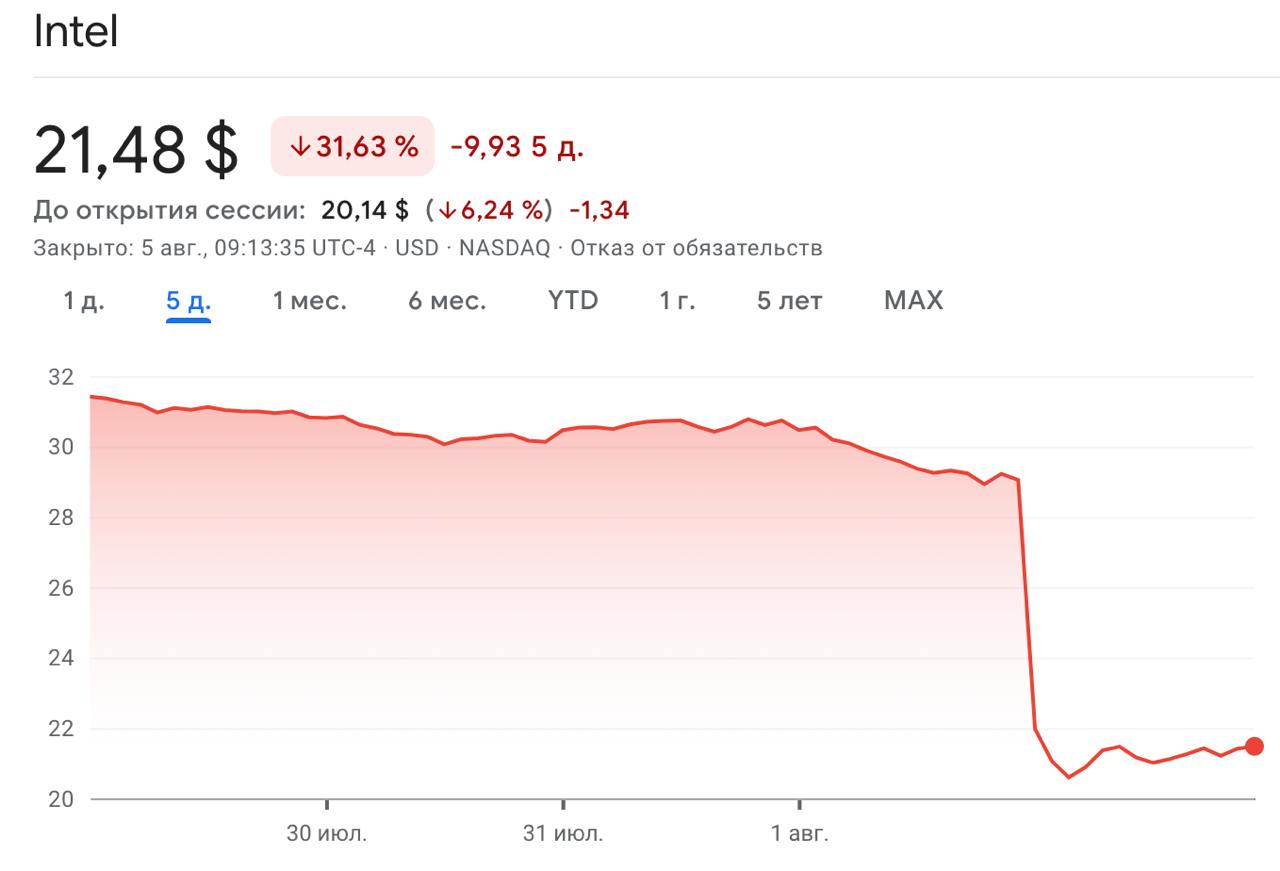 Тим часом акції компанії Intel на тлі падіння світового фондового ринку впали на 30% і продовжують падати.