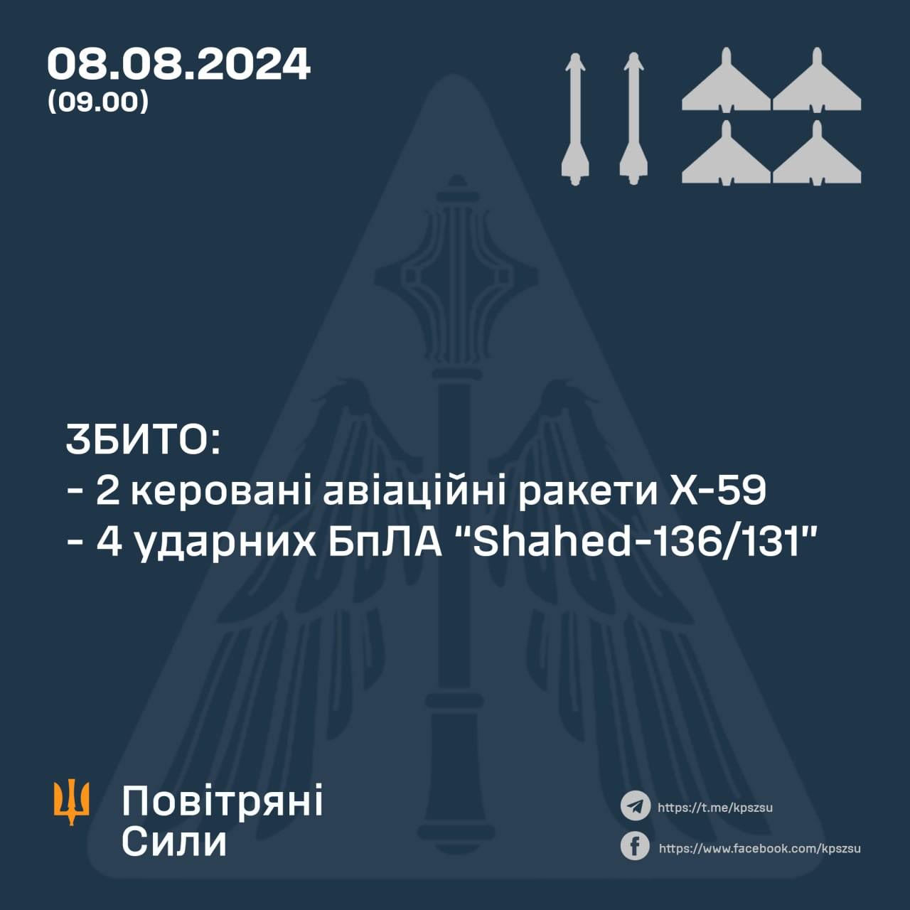 Вдалося збити обидві ракети Х-59 та всі чотири "Шахеди" в Одеській, Херсонській та Кіровоградській областях.
