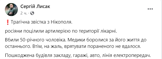 Сьогодні російські війська вдарили артилерією по території лікарні у Нікополі Дніпропетровської області. Загинув чоловік.