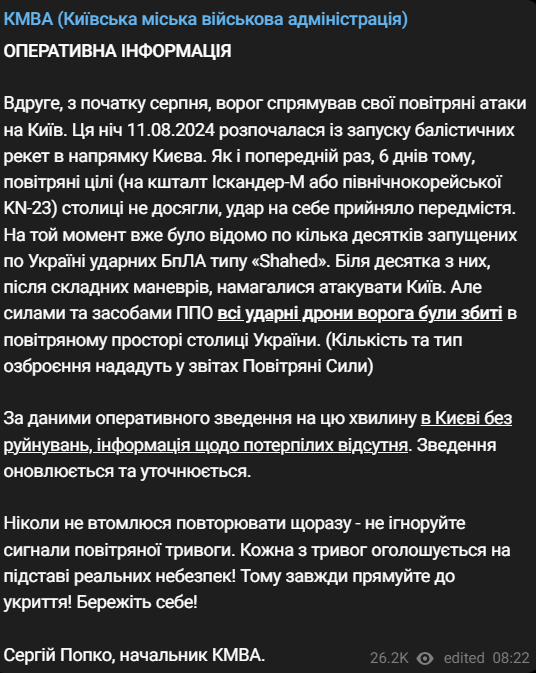 За його даними, на столицю летіли балістичні ракети "Іскандер-М" та північнокорейські KN-23, проте Києва "не досягли, удар на себе прийняло передмістя". Також війська РФ запустили Україною кілька десятків ударних БПЛА типу "Шахед". Близько десятка з них після складних маневрів намагалися атакувати Київ, але ППО збило у повітрі всі дрони.