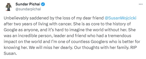 "Неймовірно засмучений втратою моєї дорогої подруги Сьюзан Воджицьки після двох років боротьби з раком. Вона така ж важлива для історії Google, як і будь-яка інша людина, і важко уявити світ без неї. Вона була неймовірною людиною, лідером та другом, яка мала величезний вплив на світ, і я один з незліченних співробітників Google, хто став кращим, дізнавшись про неї", - сказано в публікації.
