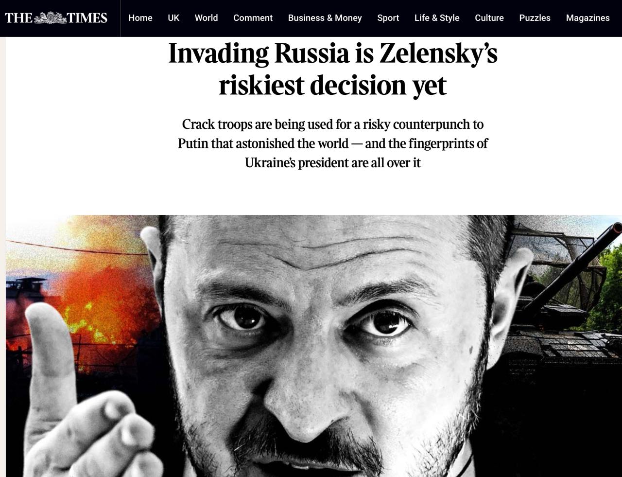 Видання називає рішення Зеленського атакувати Курську область "найризикованішим" за весь час війни. Цей наступ "застав зненацька" не тільки Москву, а й Захід, який навряд чи схвалив би такі дії, якби Київ запитав його думку.