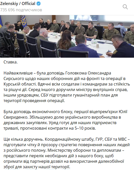 Коментуючи це засідання, президент України Володимир Зеленський публічно заявив, що ЗСУ ведуть операцію у Курській області.