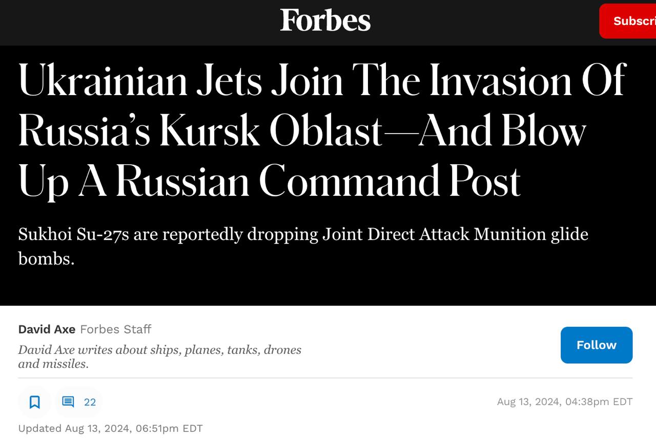Тим часом у підтримці курського настання брали участь літаки радянського виробництва. Так, Су-27 завдав удару по російському командному пункту в Теткіно, що знаходиться прямо на кордоні.