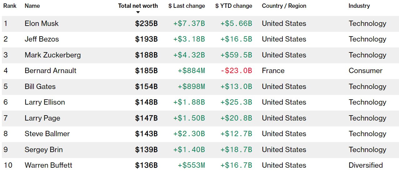 - власник LVMH Бернар Арно опустився на четверту сходинку рейтингу з активами $184 млрд. Він – єдиний неамериканець у рейтингу;