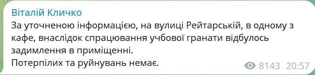 "За уточненою інформацією, на вулиці Рейтарській, в одному з кафе в результаті спрацьовування навчальної гранати сталося задимлення у приміщенні. Потерпілих та руйнувань немає", – повідомив градоначальник.