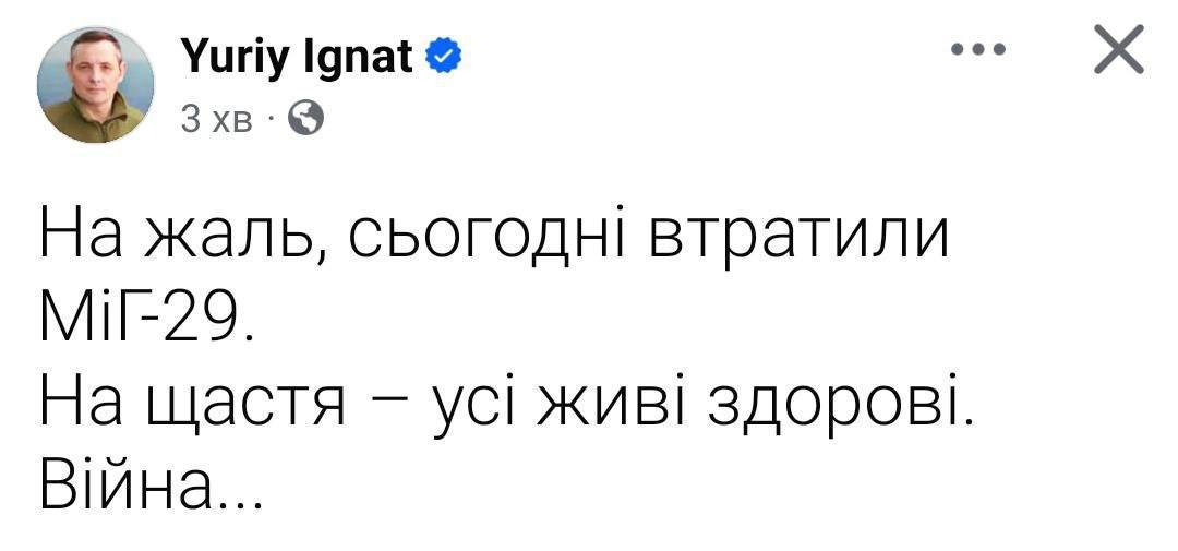 Незабаром після появи заяви колишній спікер Повітряних сил ЗСУ Юрій Ігнат підтвердив втрату МІГ-29.