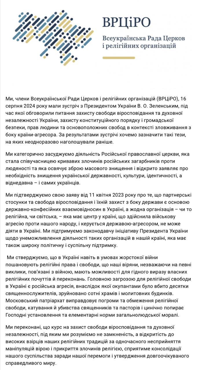 Заява зроблена за підсумками зустрічі 16 серпня з Володимиром Зеленським, під час якої члени організації "обговорили питання захисту свободи віросповідання та духовної незалежності України, захисту конституційного порядку та громадської безпеки, прав людини та основних свобод у контексті зловживання з боку країни-агресора".