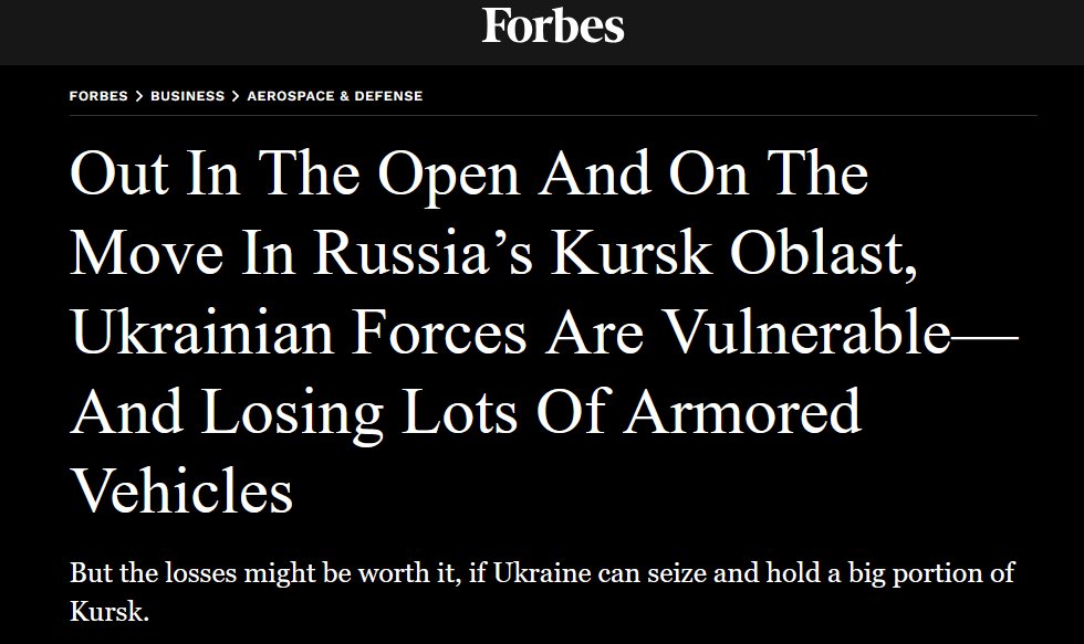 17:03 ЗСУ зазнають значних втрат військової техніки в Курській області, пише оглядач Девід Екс у матеріалі для журналу Forbes.