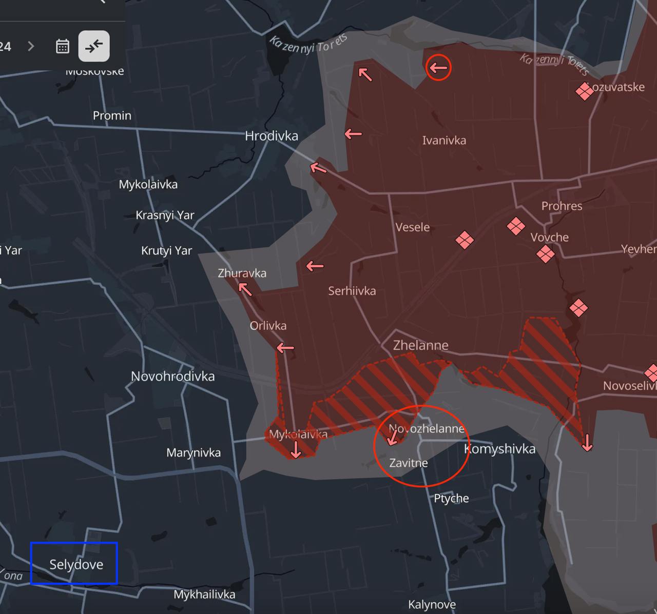 Наступ, як ми вже писали, йде у бік міста Селидове. Російські війська впритул підійшли до траси, яка веде до Покровська з боку Карлівки, на південь від якої знаходиться Селидове.