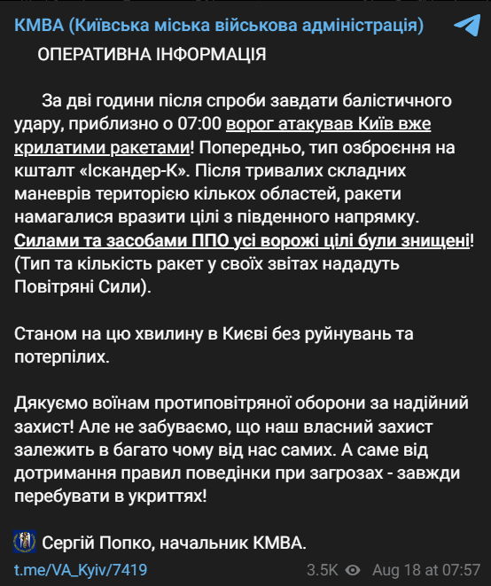 Через дві години після спроби завдати балістичного удару, о 07:00 ворог атакував Київ уже крилатими ракетами. Попередньо тип озброєння типу "Іскандер-К".