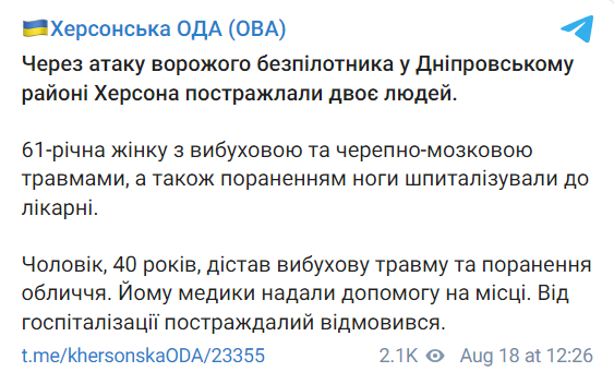 14:37 Росіяни атакували з безпілотника Дніпровський район Херсона. Постраждали двоє людей. Про це повідомляє Херсонська ОВА.