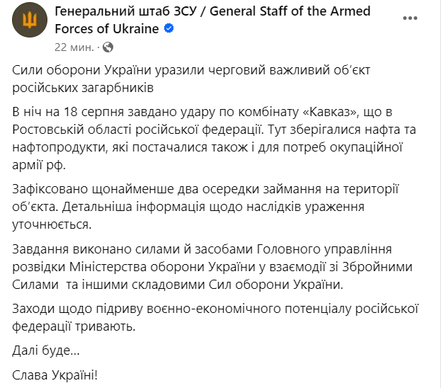 11:14 Генштаб ЗСУ підтвердив удар по Ростовській області сьогодні вночі.