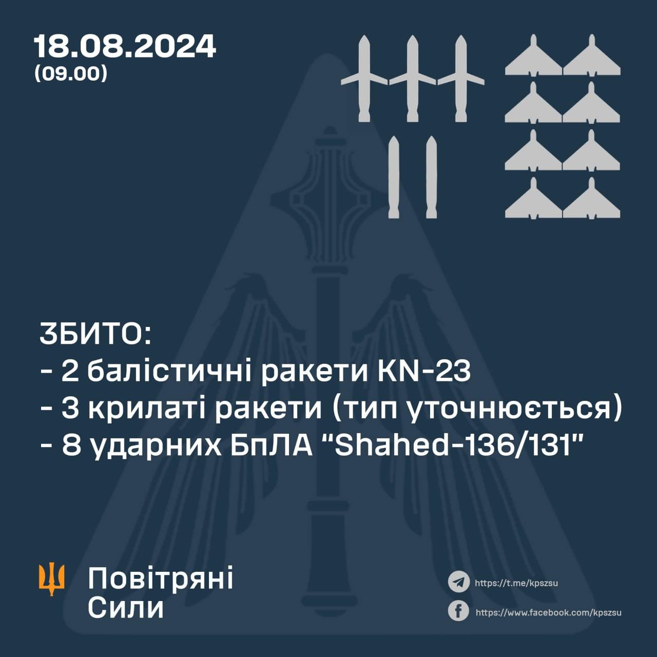 09:36 За ніч ЗСУ збили п'ять із восьми ракет, повідомляють Повітряні сили. А також усі вісім "Шахедів".