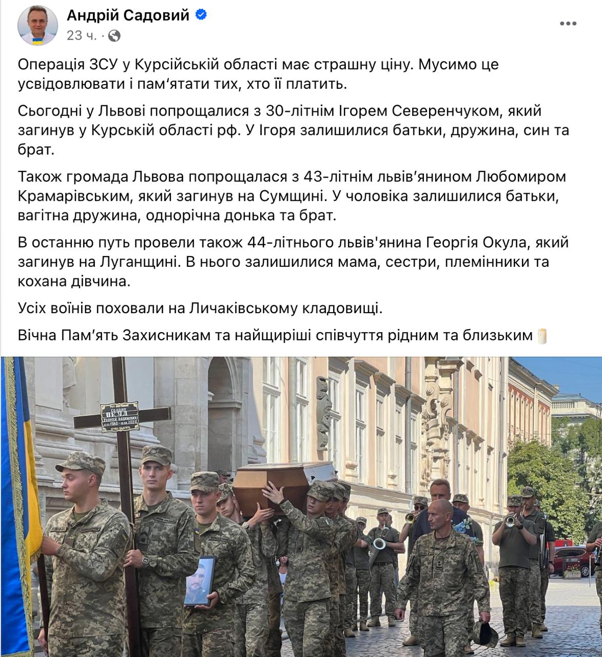 11:52 Операція ЗСУ у Курській області "має свою страшну ціну", заявив мер Львова Андрій Садовий.