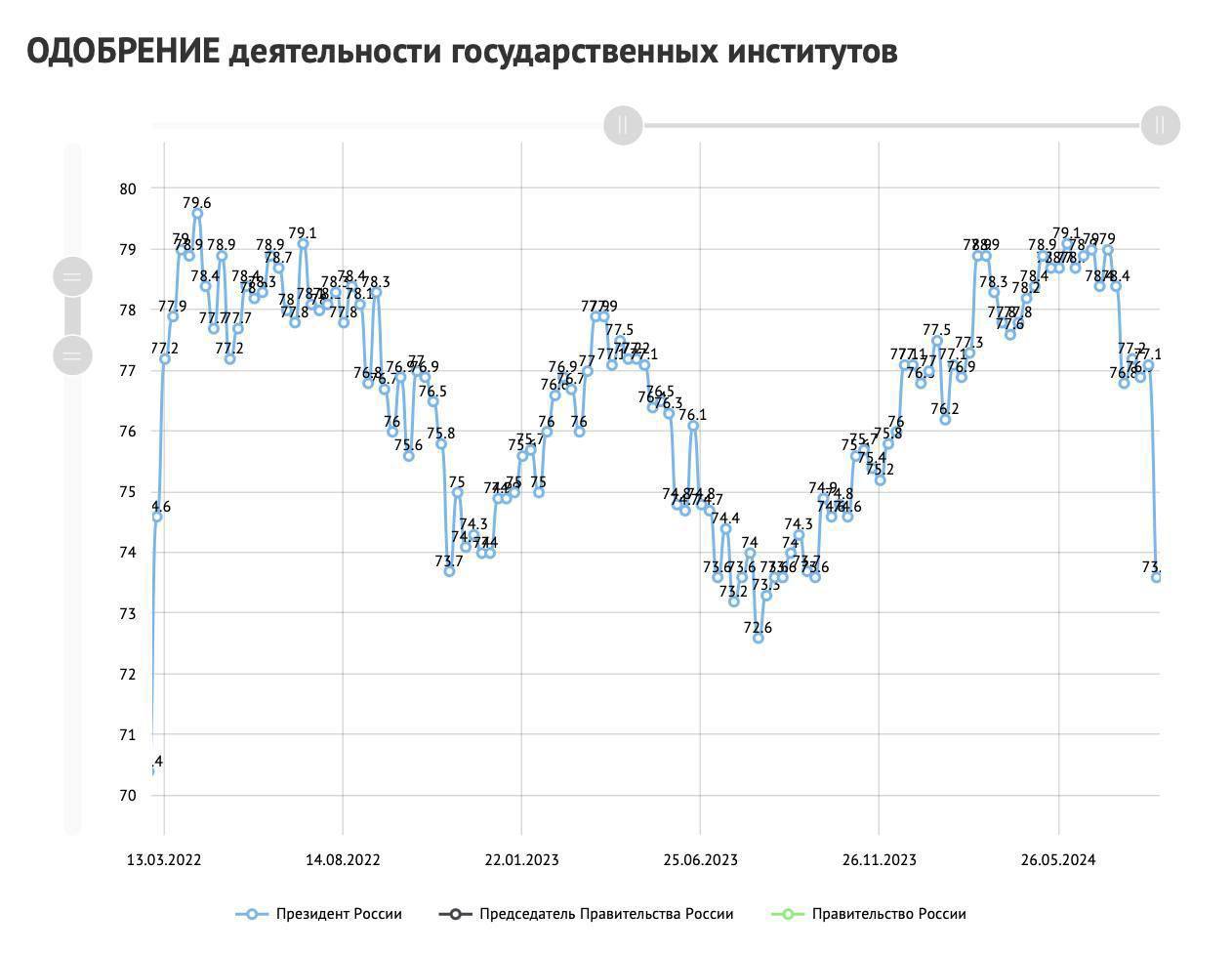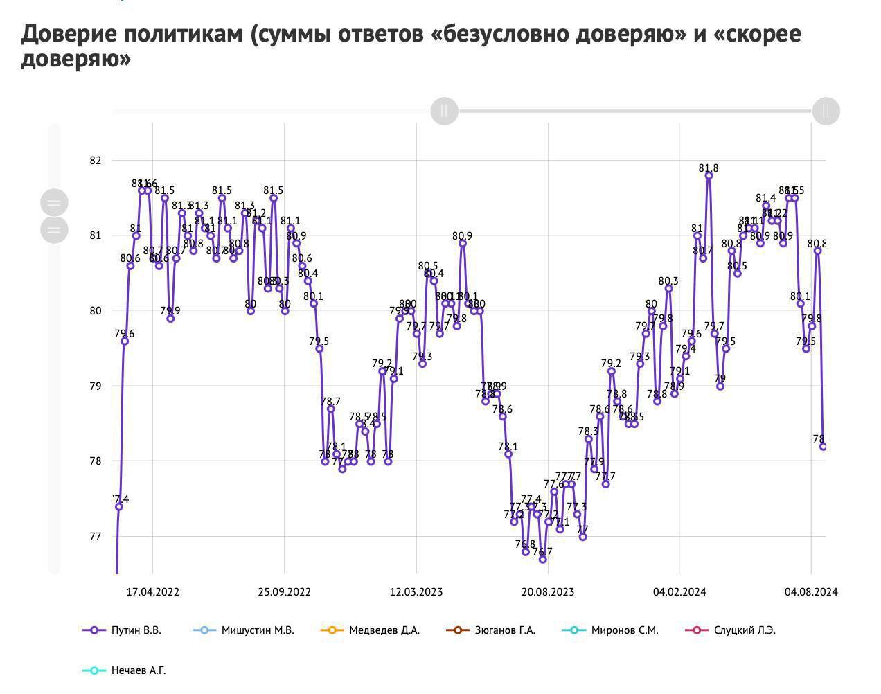 Судячи з динаміки її рейтингів, це не найбільше падіння рівня підтримки Путіна з початку війни в Україні. Трохи нижче падала довіра невдовзі після заколоту Пригожина. Приблизно до такого рівня воно знизилося і під час мобілізації восени 2022 року.