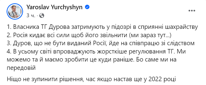 Зазначимо, що Юрчишин уже давно виступає за жорсткі обмеження месенджера Telegram.
