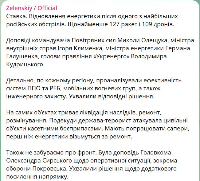 18.36 Мінімум 127 ракет і 109 дронів запустила сьогодні РФ Україною, повідомив Зеленський.