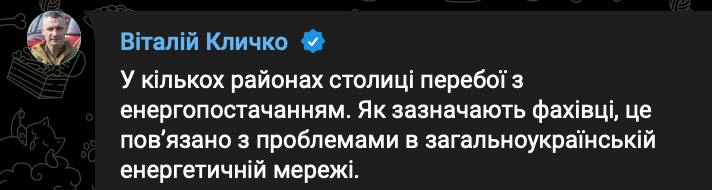 9.00 Кличко підтвердив проблеми зі світлом у кількох районах Києва.