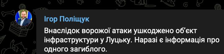 9.08 У Луцьку приліт об'єктом інфраструктури. Є загиблий, повідомляє мер міста.