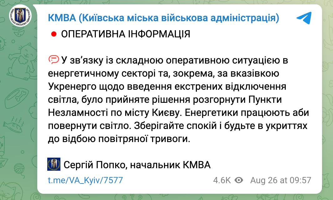 9.12 По всій Україні запроваджено екстрені відключення світла, повідомляє ДТЕК.
