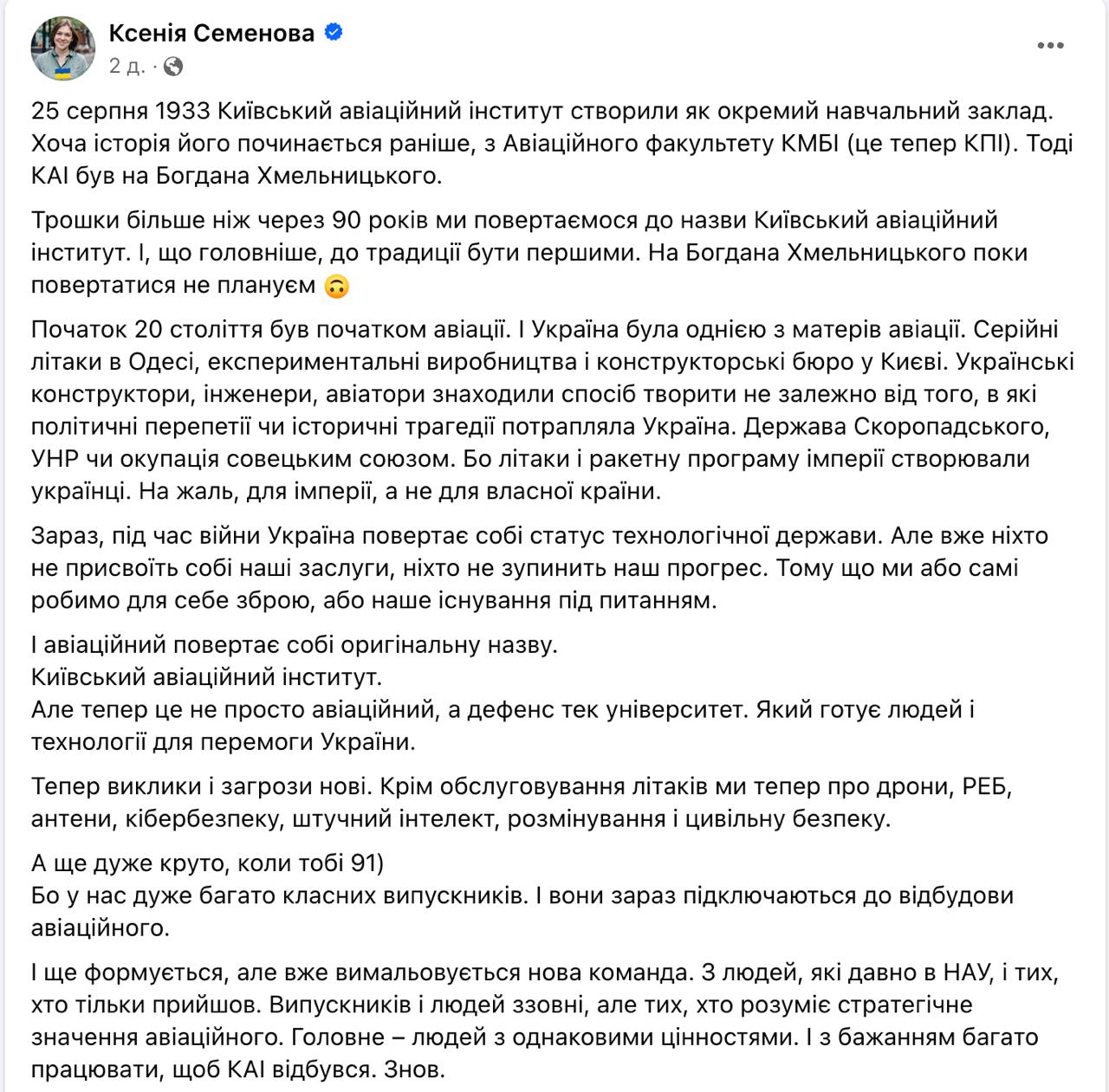"25 серпня 1933 р. Київський авіаційний інститут створили як окремий навчальний заклад. Хоча історія його починається раніше, з Авіаційного факультету КДБІ (це тепер КПІ). Тоді КАІ був на Богдана Хмельницького. Трохи більше ніж через 90 років ми повертаємось до назви Київський авіаційний інститут. І, що найголовніше, до традиції бути першими", - написала Семенова.