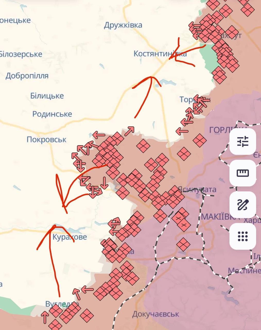 "Противник перерізав трасу Покровськ - Карлівка. Наміри його очевидні: для того і вбивається покровський виступ, щоб зрізати курахівський і торець фланговими ударами. Таким чином (якщо йому вдасться) противник хапанет центральні райони Донецької області, вони ж - південні з тих, що підконтрольні нам ще", - написав він і навів карту передбачуваних планів РФ.