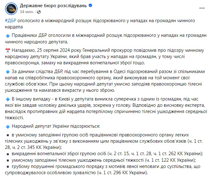 У Бюро нагадали, що 25 серпня Офіс генпрокурора повідомив Дмитруку про підозру в нападах на людей, у тому числі правоохоронця, замах на викрадення вогнепальної зброї та іншого. За даними слідства ДБР, під час перебування в Одесі нардеп разом із спільниками напав на співробітника правоохоронного органу, який на той момент виконував свої службові обов'язки. При цьому депутат навмисне завдав правоохоронцю тілесних ушкоджень і намагався викрасти у нього зброю.