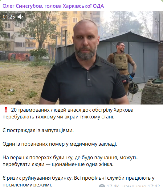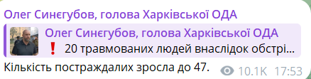 Внаслідок обстрілу Харкова 20 поранених перебувають у тяжкому чи вкрай тяжкому стані. Загалом на даний момент 47 поранених та п'ять загиблих.