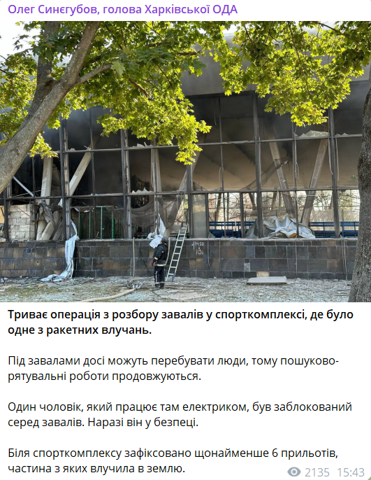 15:46 Продовжується операція з розбору завалів спорткомплексу в Харкові, де було одне з ракетних влучень, повідомив голова ОВ Олег Синегубов.