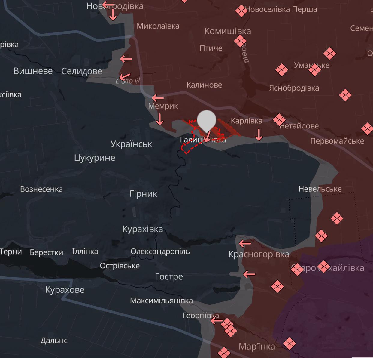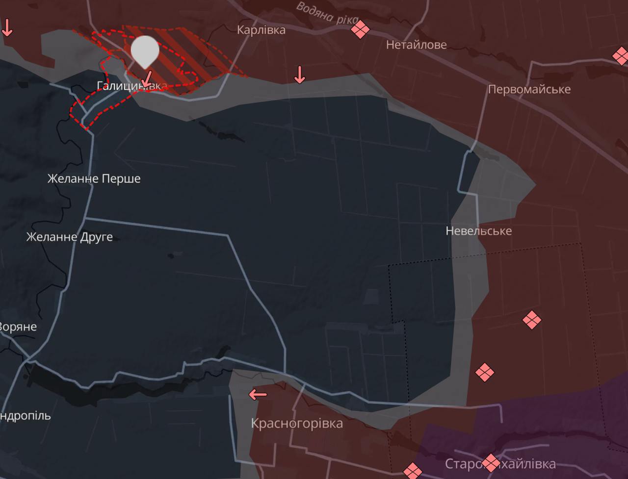 Галицинівка, згідно з картою Deep State, під контролем України лише на півдні. Решта території або під РФ, або в сірій зоні (тобто там йдуть бої).