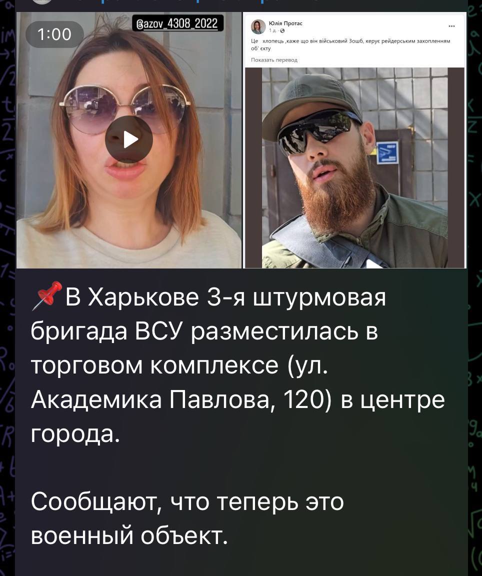 Тим часом у харківських телеграм-каналах зараз поширюється відео та повідомлення у соцмережах харків'янки, яка заявляє, що 3-я штурмова бригада "здійснила рейдерське захоплення" торговельного центру на Академіка Павлова та оголосила його військовим об'єктом. Що було помічено в російських військових пабликах (скрин повідомлення).