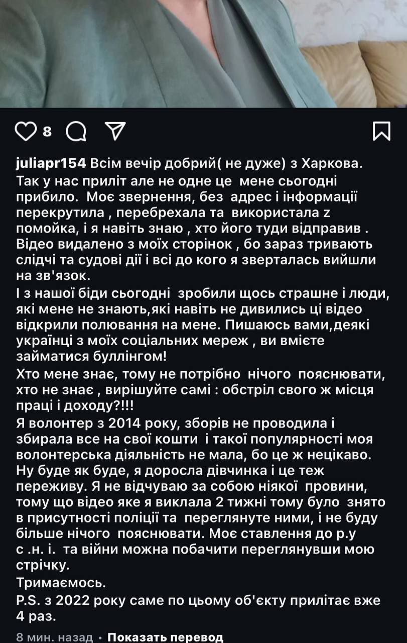 Пізніше харків'янка Юлія Протас заявила про цькування після свого відео про 3-ю штурмову бригаду.