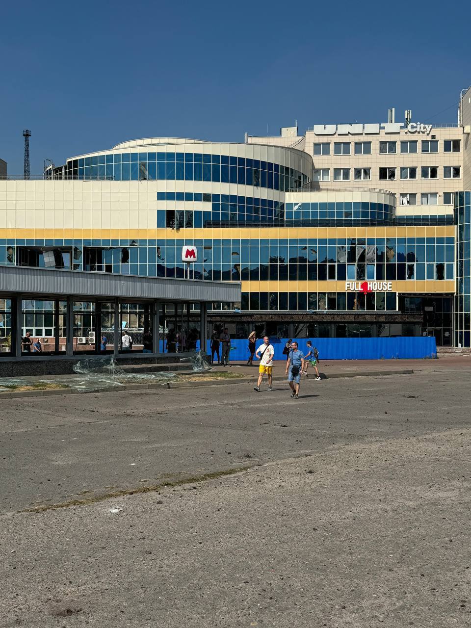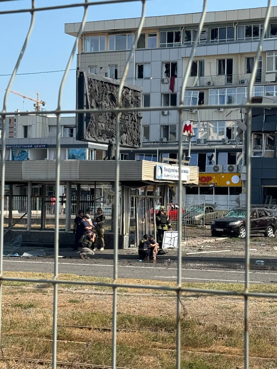 Наслідки прильоту у районі станції метро Академіка Павлова. Видно руйнування торгового центру та пошкодження газопроводу.