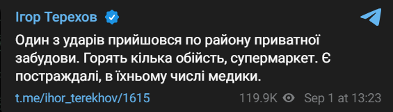 Один із ударів припав по району приватної забудови. Горять кілька приватних будинків та супермаркет.