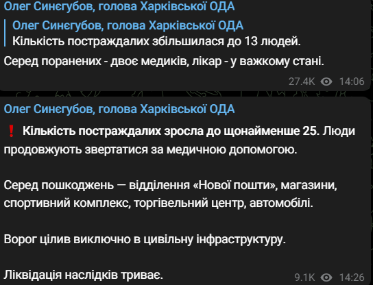 Сьогодні вдень росіяни завдали Харкова близько 10 ударів, є пошкодження цивільної інфраструктури та потерпілі. Удар наносився ракетами.