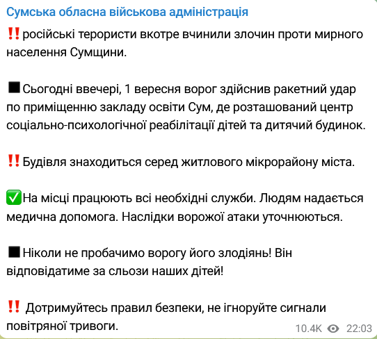 У неділю, 1 вересня, росіяни обстріляли місто Суми. Ракета потрапила по центру соціально-психологічної реабілітації дітей та по дитячому будинку, розташованому в тому самому будинку.