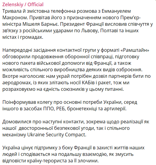 «Напередодні засідання контактної групи у форматі «Рамштайн» обговорили продовження оборонної співпраці, підготовку нового пакету військової допомоги від Франції та можливість спільного виробництва деяких видів озброєння. Ще раз наголосив: нам вкрай потрібен дозвіл партнерів бити по аеродромах, з яких злітають носії КАБів та ракет, тому ми розраховуємо на єдність союзників у цьому питанні», – розповів український президент.
