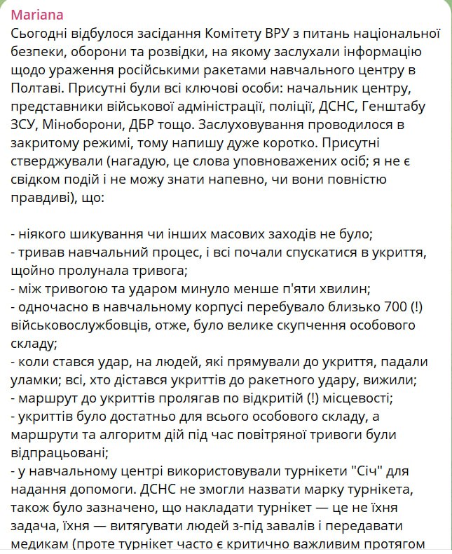 20:56 Подробиці ситуації з ударом по військовому інституту зв'язку в Полтаві, озвучені на закритому засіданні оборонного комітету Ради, опублікувала заступник голови комітету Мар'яна Безугла.