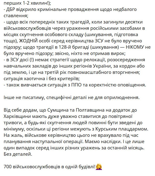 – щодо всіх попередніх таких трагедій, коли загинули десятки військовослужбовців через поразку російськими коштами у місцях скупчення особового складу (побудова, підготовка тощо), жодній особі серед керівництва ЗСУ не було вручено підозру. У тому числі нікому не було вручено підозру у справі про трагедію у 128-й бригаді (побудова). І, звісно, ніхто не отримав вирок;