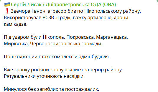 "Під ударом були Нікополь, Покровська, Марганецька, Мирівська, Червоногригорівська громади. Пошкоджено птахокомплекс та адмінбудівлю", - написав він.