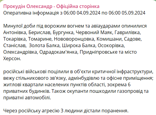 Минулої доби росіяни обстрілювали Антонівку, Берислав, Бургунку, Червоний Маяк, Гаврилівку, Токарівку, Томарине, Нововоронцовку, Камишани, Садове, Станіслав, Золоту Балку, Широку Балку, Осокорівку, Олександрівку, Одру.
