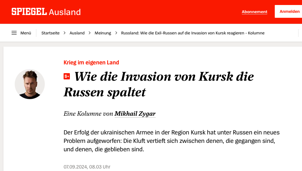 Журналіст Михайло Зигар написав статтю в Der Spiegel про те, як наступ української армії в Курській області посилив розкол між росіянами, які залишили країну і залишилися. А також розкол усередині російських лібералів.